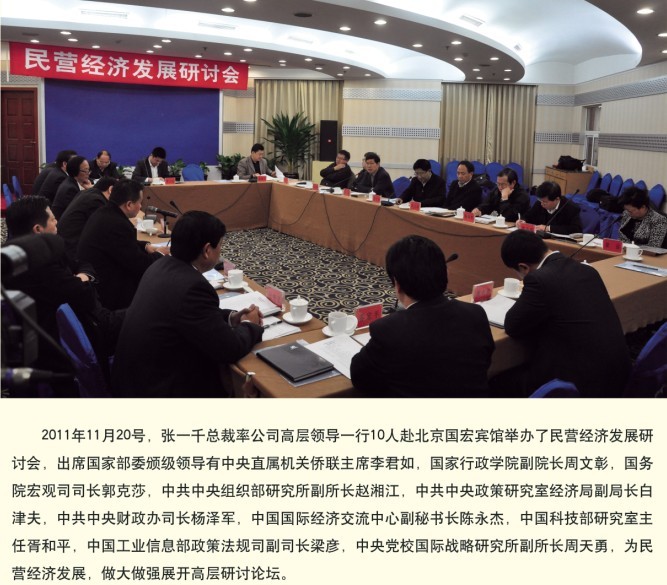 2013年3月18日,张一千总裁率集团高层领导赴北京国宏宾馆举办“学习十八大及两会精神,促进民营经济发展”研讨会。出席中央有关部门领导有:国务院政策研究室原主任、现中国国际交流中心执行副理事长魏礼群,中共中央研究室司长杨丙见,国务院政策研究室司长陈文玲、邓文奎,中央统战部司长胡林辉,国家发改委副司长欧阳进。